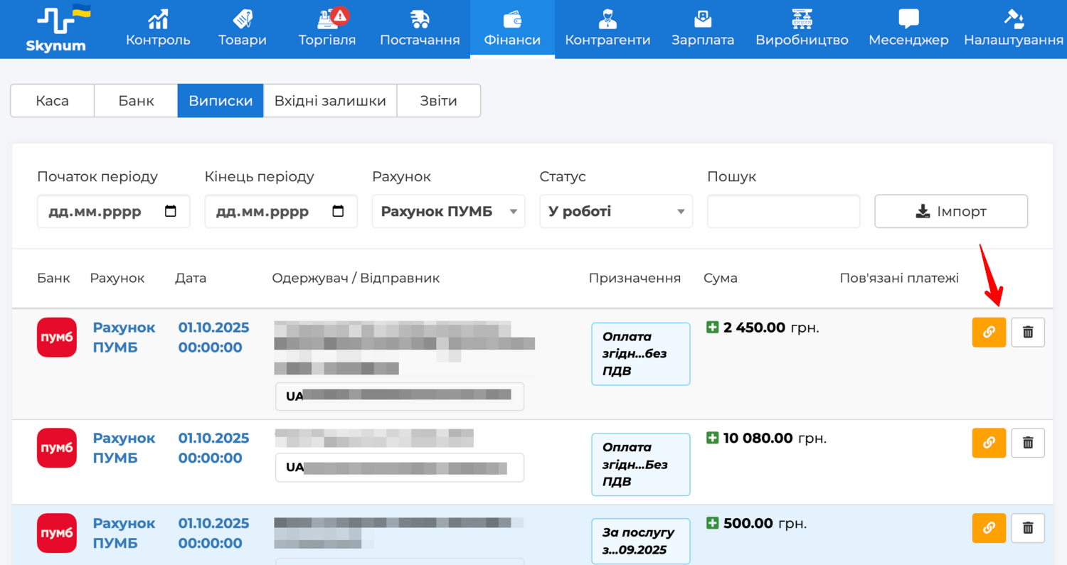 Після імпорту ви можете працювати з виписками у Skynum так само, як і з тими, що надходять автоматично з інтегрованих банків.