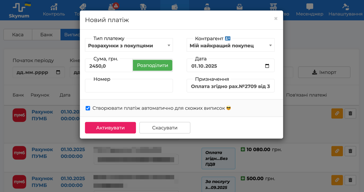 Виписку можна прив’язати до замовлення, накладної чи документа постачання. Під час створення платежу система автоматично підтягне дані з виписки — суму, дату, призначення. Це зручно, коли надходження стосуються певного клієнта або постачальника.