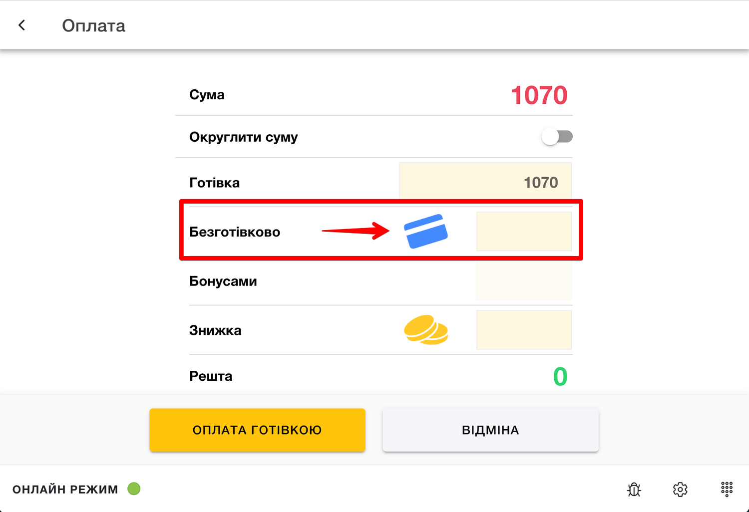 У чеку повернення залиште тільки ті товари, які потрібно повернути покупцю, а решту видаліть. Після цього натисніть «Оплата» та знову натисніть іконку банківської картки в полі «Безготівково».