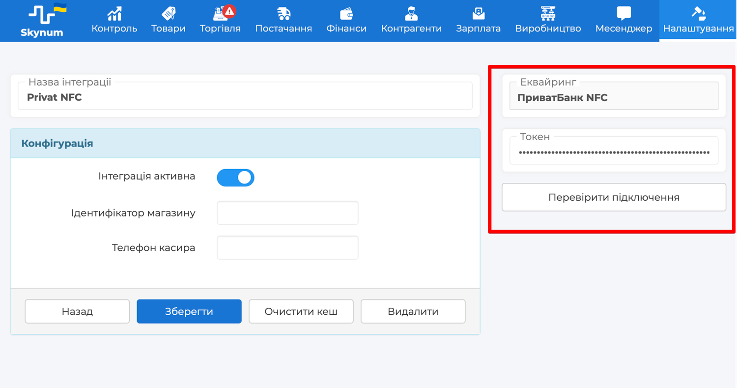 Після цього натисніть «Зберегти». На цьому налаштування інтеграції в платформі Skynum завершено.