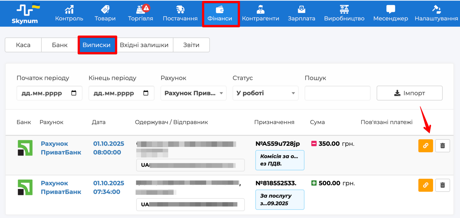 Виписку можна прив’язати безпосередньо до замовлення, накладної чи документа постачання. Під час створення платежу система автоматично підтягує реквізити з виписки — суму, дату, призначення. Це зручно для замовлень у резерві та документів, за якими очікується оплата.