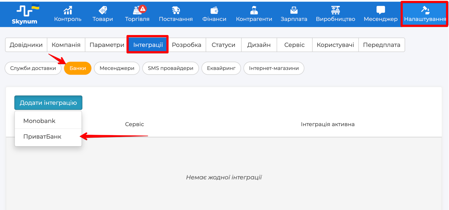 Для налаштування інтеграції відкрийте розділ Налаштування → Інтеграції → Банки, додайте нову інтеграцію та оберіть «ПриватБанк».