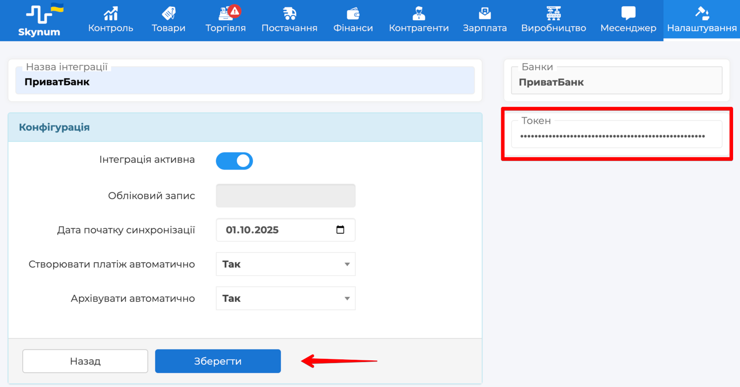 Вставте цей токен у поле Токен під час налаштування інтеграції у Skynum.