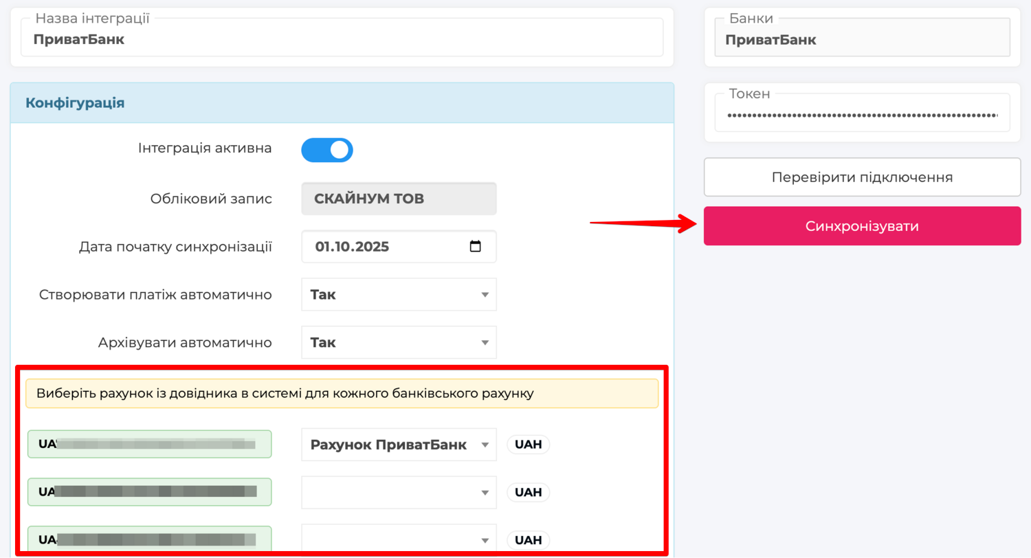 - Токен — у це поле потрібно вставити токен, отриманий у системі Приват24 для бізнесу.