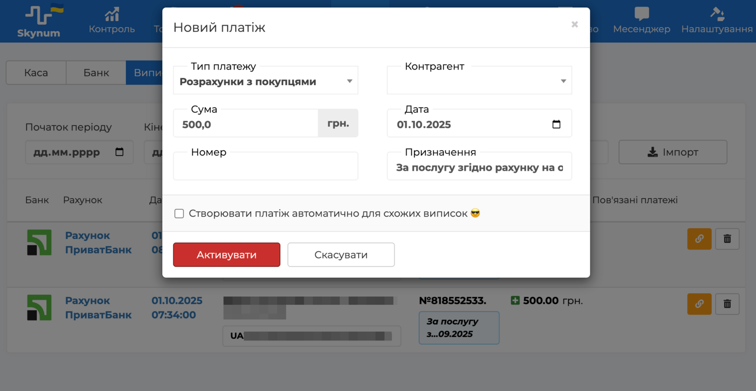 - Створювати платіж автоматично — якщо обрати «Так», система автоматично створюватиме та активуватиме платежі за новими виписками. Для кожного рядка доступна опція «Створювати платіж автоматично для схожих виписок», завдяки чому система поступово навчається створювати платежі самостійно.